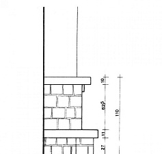 Пристенная облицовка с банкеткой справа. Боковые детали и цоколь из розового мрамора perlino. Плита и отделка из полированного красного asiago. Балка из темного дерева.