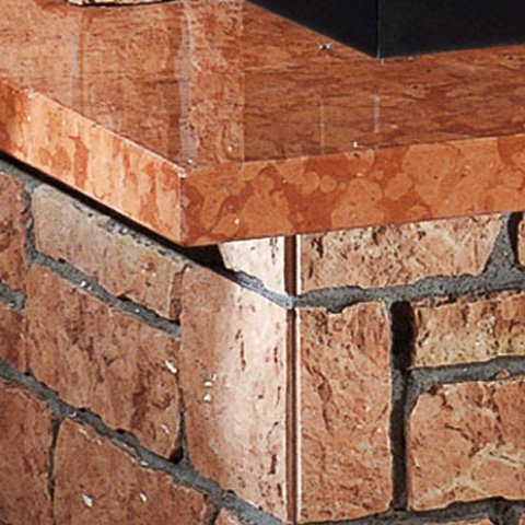 Камин в деревенском стиле с плитой из полированного мрамора трани и колотого мрамора вичентино, балка и решетка в цокольной части- деревянные. Как вариант возможно изготовление плиты из полированного красного Асьго, а самого камина из колотого красного мрамора Асьяго (как на фото). Массивная деревянная балка.